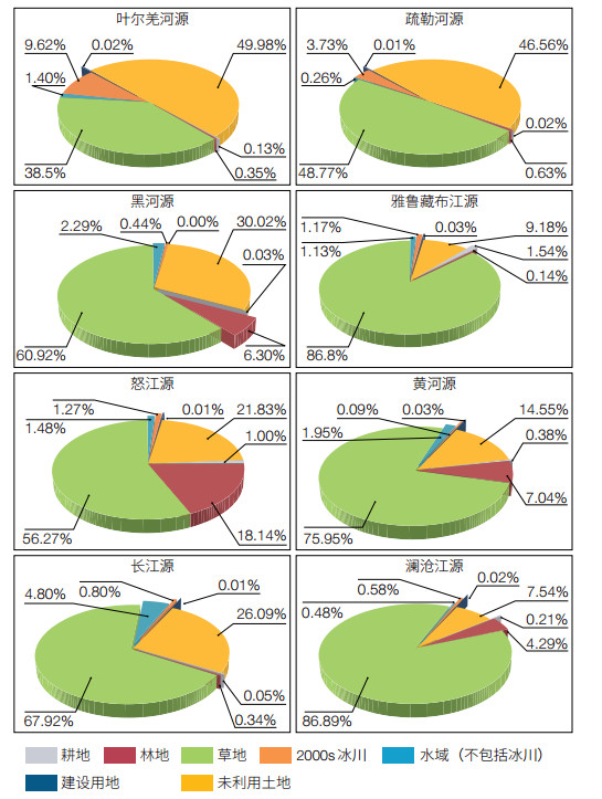 | 图 2 青藏高原8个流域的土地利用分布图 除叶尔羌河源和疏勒河源外其他流域主要土地利用类型均为草地;各流域未利用土地占比排序为叶尔羌河源>疏勒河源>怒江源>雅鲁藏布江源>长江源>澜沧江源>黑河源>黄河源;冰川占比排序为叶尔羌河源>疏勒河源>黑河源>长江源>怒江源>黄河源>雅鲁藏布江源>澜沧江源 |