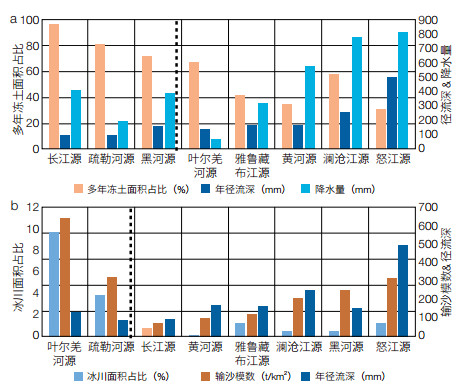 | 图 3 青藏高原8条河流多变量对比图 (a)年径流深与降水量和多年冻土面积对比;(b)输沙模数与径流深和冰川面积占比对比 |