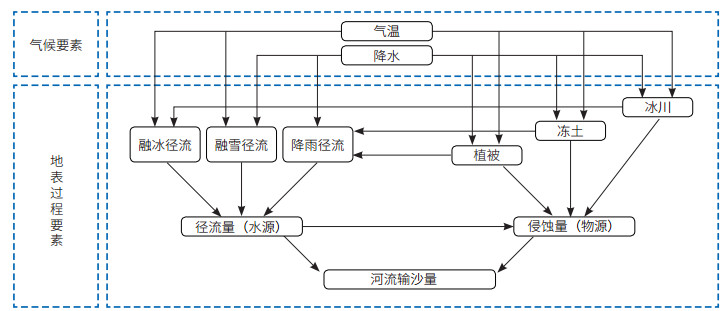 由于研究区位于河流的源区或上游,人类活动规模较小因此暂不考虑人类活动的影响。图 4展示了影响青藏高原河流输沙量的多因素作用示意图,其中影响河流输沙量变化的气候要素主要包括气温和降水,地表过程要素主要包括冰川、冻土、植被覆盖、融冰径流、融雪径流和降雨径流等。