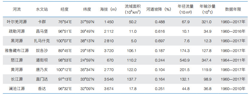 土壤圈层是连接岩石圈、水圈、大气圈和生物圈的关键界面。青藏高原特殊的自然地理条件使其土壤发育较差、土层薄、风化程度较低[12]。土层一经破坏极易造成生态环境的迅速恶化,给高原人口的生存、发展造成损失。河流输沙量是量化区域土壤资源减少及生态环境变化的重要指标。为总体认识青藏高原水土流失情况,本文统计了8条主要河流的多年平均年径流量和年输沙量。表 1列出了青藏高原出山口水文站、数据年限及流域面积等信息。这8条河流平均每年从青藏高原输出的径流总量为1 179.2亿立方米,输出的悬移质总量为1.099亿吨。按照流域平均年降水量排序,依次为怒江源>澜沧江源>黄河源>长江源>黑河源>雅鲁藏布江源>疏勒河源>叶尔羌河源;按照平均年径流量排序,依次为怒江源>黄河源>雅鲁藏布江源>长江源>叶尔羌河源>澜沧江源>疏勒河源>黑河源;按照平均年悬移质输沙量排序,依次为怒江源>叶尔羌河源>雅鲁藏布江源>黄河源>长江源>澜沧江源>疏勒河源>黑河源。