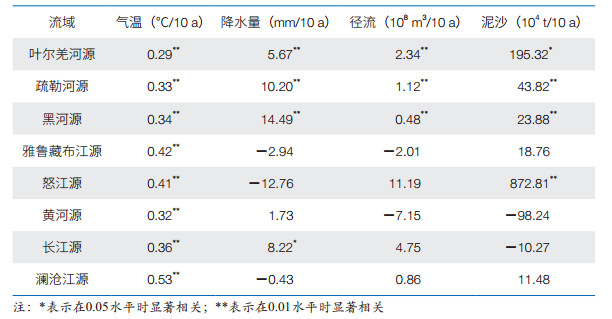 3 青藏高原河流输沙量变化特征表 2列出了8条河流气温、降水量、径流量、输沙量的年际变化mann – kendall和pettitt显著性检验结果。分析结果表明:8个流域的气温均呈显著增加趋势,其中澜沧江源升温速率最高(0.5℃/10 a)外,其他7个流域的升温速率在0.3℃/a —0.4℃/a范围内变化。3条内流河(叶尔羌河、疏勒河源、黑河源)的降水量在α=0.01水平上呈显著增加趋势,长江源的降水量在α=0.05水平上显著增加,其他4个流域的降水量变化在统计上不显著,其中雅鲁藏布江源、怒江源和澜沧江源的降水量呈微弱下降趋势,而黄河源的降水量呈微弱上升趋势。对于径流量和输沙量,3条内流河(叶尔羌河源、疏勒河源、黑河源)以及怒江源呈显著增加趋势,雅鲁藏布江源、黄河源、长江源和澜沧江源的变化趋势统计上不显著。