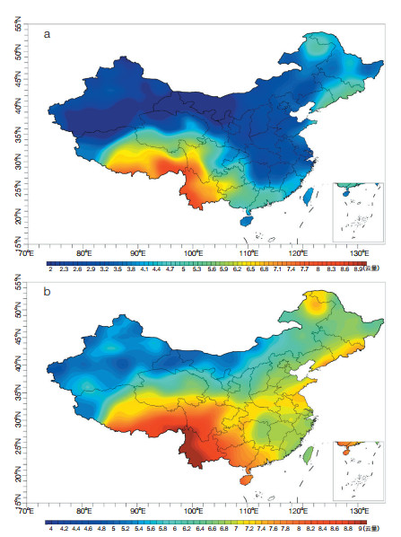 | 图 1 1961—2015年中国陆地区域7月云量分布 (a)低云量;(b)总云量 |