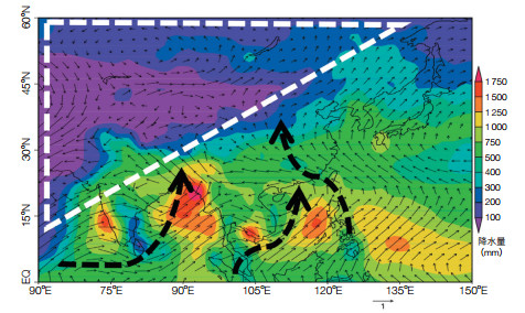 (3)“世界屋脊”“中空热岛”是青藏高原“亚洲水塔”与中低纬乃至南半球能量、水分循环交换的关键“驱动源”。青藏高原特殊的“热驱动”为陡峭南坡源自低纬海洋乃至跨半球水汽流强“汇流”提供了动力机制。青藏高原南侧东起菲律宾以东洋面,经过我国南海,西至东非索马里、阿拉伯海、印度洋(“大三角扇形”),在高原热驱动下青藏高原南坡源自低纬乃至南半球的水汽输送“汇流”构成了“亚洲水塔”的“水汽供应源”,这揭示了季风过程“亚洲水塔”与中低纬海洋多尺度大气水分循环相互作用机制。