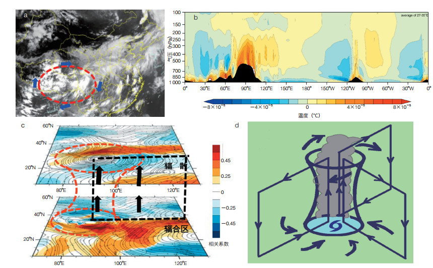 | 图 3 青藏高原“热泵”效应 (a)风云卫星动态图;(b)1979—2016年夏季27.5º—35ºe东—西气温纬向偏差垂直剖面图;(c)1979—2018年夏季青藏高原视热源与东亚地区水汽输送通量高(200 hpa)、低层(500 hpa)相关矢场;(d)台风涡旋三维环流结构示意图 |