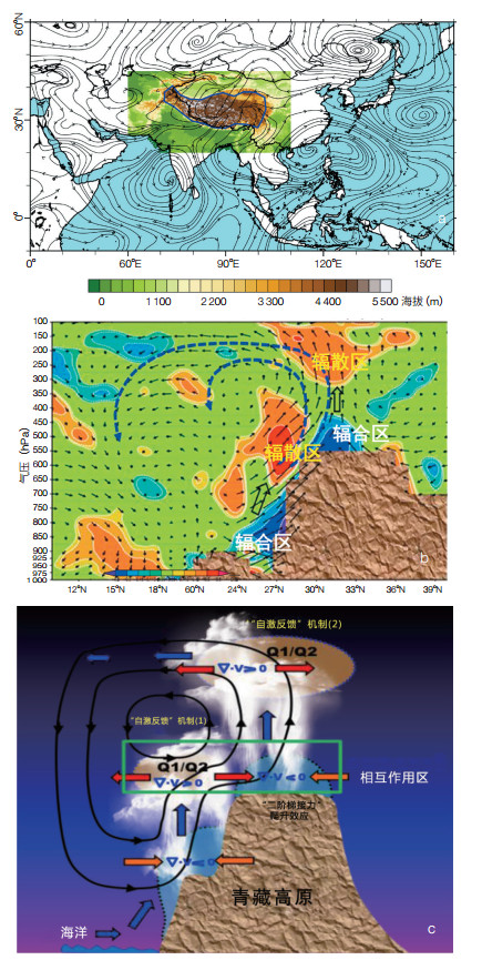 通过青藏高原整层视热源(q1)与高原区域垂直运动、散度三维相关结构综合分析亦可发现视热源q1相关散度结构,即南坡低层辐合-坡顶辐散与青藏高原主体低层辐合-上空辐散形成耦合“二阶梯接力”爬升效应。此青藏高原特殊的“热驱动”为陡峭南坡源自低纬海洋乃至跨半球水汽流强“汇流”提供了动力机制(图 4b和c)。