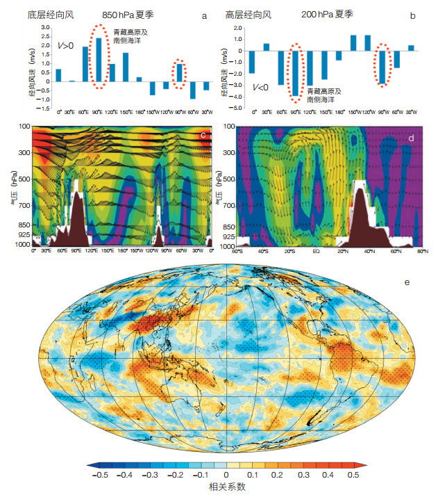 | 图 5 青藏高原云结构及其跨半球尺度环流区域、全球影响效应 (a)1948—2010年30°e—30°w平均气压850 hpa下不同经度(30°间隔)的夏季经向风速;(b)1948—2010年30°e—30°w平均气压200 hpa下不同经度(30°间隔)的夏季经向风速; (c)1948—2006年6—8月青藏高原平均夏季27.5°n—35°n纬度带纬向风速和垂直速度的高度-经度剖面图(彩色阴影为纬向风速和垂直速度的矢量模);(d)80°e—110°e经度带经向风速和垂直速度的高度-纬度剖面图(彩色阴影为经向风速和垂直速度的矢量模)[36];(e)1979—2014年夏季青藏高原站点平均低云量与全球低云量相关系数场 |