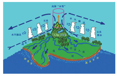 (5)青藏高原构成地球上“世界水塔”行星尺度陆地—海洋—大气水循环物理图像。从全球水循环的视角,提出的青藏高原作为全球性大气“水塔”的观念,认为在热力驱动背景下通过区域、跨半球能量、水汽输送建立了青藏高原地区“亚洲水塔”的“供水”“蓄水”与“排水”的循环体系,特别是青藏高原地表冰川,积雪和湖泊作为“蓄水池”系统,江河源可作为“输水管道”,将“亚洲水塔”的水向外输送出去,高层大气也提供向外输送的渠道。青藏高原特殊的跨区域、跨半球大气水分循环可构建“世界水塔”独特的大气-水文功能体系,其综合描绘了青藏高原“世界水塔”及其地球上一个完整的行星尺度陆地—海洋—大气水循环物理图像。