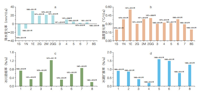 据统计,近年来青藏高原地区降雨基本呈增加趋势(0.1—15 mm/10 a,图 1a),气温整体上升(0.20℃—0.55℃/10 a,图 1b),冰川普遍强烈退缩(退缩率约为(0.2%—1.2%)/a,图 1c),且近年退缩幅度逐渐加剧[9-13]。青藏高原冰湖个数与面积增加(冰湖扩张率约为(0.3%—1.6%)/a,图 1d),尤其在2000年后,湖泊总数增加13%以上,面积也显著扩张,如阿尔金山、喀喇昆仑、昆仑山等地区年扩张速度均大于1%[14]。冰湖扩张一方面降低了冰川水储量,致使可流动的液态水大大增加;另一方面,冰湖库容增大了冰湖溃决的风险,也为洪水、泥石流等提供了更好的孕灾环境。例如,自20世纪30年代以来,西藏境内就记载了30余次冰湖溃决事件[10, 11]。