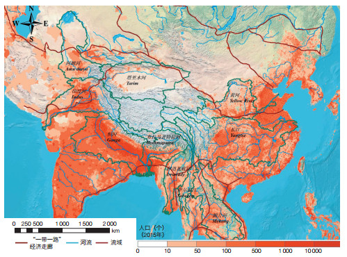 高亚地区的人口密度分布充分体现了人类活动对“亚洲水塔”的高度依赖性(图 2)。我国的长江和黄河、印度和巴基斯坦的恒河和印度河皆起源于“亚洲水塔”,这些流域聚集了很多人口密度在1万人/平方公里或超过1万人/平方公里的地区。在这些流域内,2015年总人口多达17亿①。另外根据已有的数据②,2005年相关流域国内生产总值(gdp)就已高达7万亿美元[3]。新的数据表明,2015年以购买力平价衡量的流域gdp达到了12.7万亿美元③。