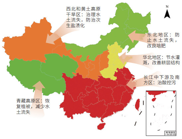 (3)长江中下游及南方地区。自然条件优越,是我国热量资源和水资源最丰富的地区,但也是中产田分布较多的地区。近年来,我国南方地区土壤酸化日益加剧,污染严重。重点在于治酸控污,制定土壤酸化和污染治理与修复规划,开展治理与修复工程及示范;土地治理过程中应注意改造低产坡耕地或退耕恢复植被。