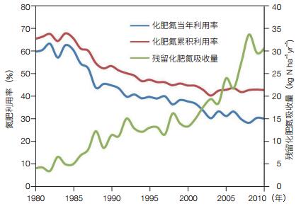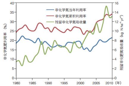 | 图 3 1980—2010年我国农田化学氮肥的当年和累积利用率的变化趋势 |