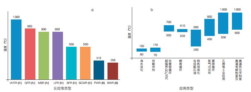 | 图 1 不同核反应堆及应用的温度范围 (a)不同反应堆(代)的出口温度,其中vhtr—超高温反应堆、gfr—气冷快堆、msr—熔盐堆、lfr—铅冷或铅-铋共熔物冷却的快堆、sfr—钠冷快堆、scwr—超临界水堆、pwr—压水反应堆、bwr—沸水堆;(b)核能综合利用温度范围 |