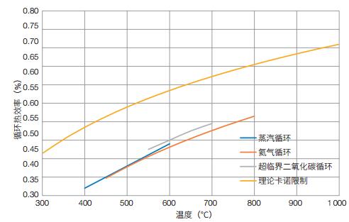 3 核能利用研究现状 3.1 高效发电针对堆内运行温度在700℃以上的第四代先进核能系统,现阶段较为成熟的热功转换系统主要包括蒸汽轮机系统(基于朗肯循环)以及闭式循环燃气轮机系统(基于闭式布雷顿循环)。根据工质的不同,闭式循环燃气轮机亦可分氦气轮机、氮气轮机、超临界二氧化碳轮机及混合工质轮机等,不同热工转换系统效率对比如图 2所示。从图中可以看出,温度越高,热功转换系统效率越高,相比较传统蒸汽循环,高温条件下的热循环发电系统,能够更充分地利用700℃以上核能系统的高品质热量,实现高效发电。