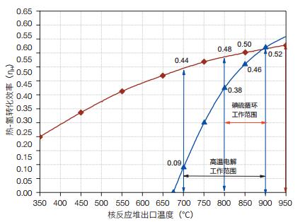 3.2 核能制氢第四代核能反应堆制氢方面的研究,其核心都是基于高温堆的工艺热。从核反应堆的角度来看,熔盐堆、超高温气冷堆等出口温度都超过700℃,所提供的工艺热都可以满足高温制氢过程,其系统效率和反应堆能提供的热能温度有很大的相关性(图 3)[10, 11]。目前核能制氢主要有两种途径:热化学循环制氢和高温电解制氢。