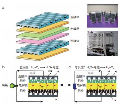 | 图 4 固体氧化物燃料电池(sofc)/固体氧化物电解池(soec)电堆结构和发电/制氢两种模式工作原理 (a)sofc/soec结构示意图;(b)sofc发电工作原理;(c)soec高温电解制氢工作原理 |