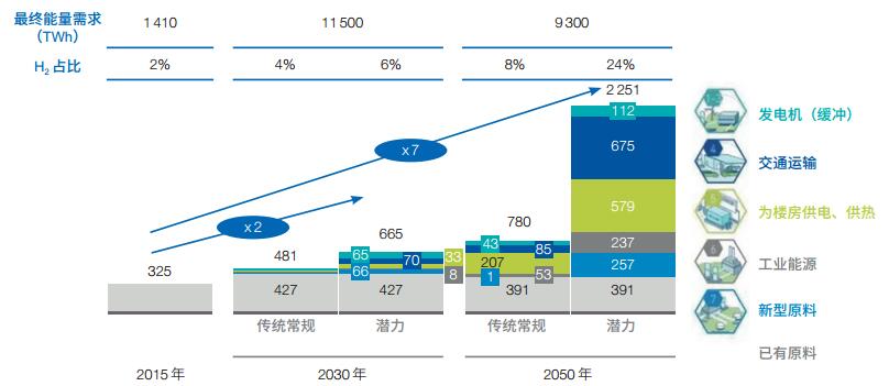 2.3 欧洲氢能与燃料电池发展现状近期,欧洲燃料电池和氢能事业联合组织(fch ju)发布了“欧洲氢能路线图”(图 1)[7]。该路线图提出了欧洲氢能未来30年的发展规划,并得到欧洲17家氢能公司和组织的支持。该报告认为,氢是欧洲能源转型的重要元素,到2050年可占最终能源需求的24%并提供540万个工作岗位。为了实现欧洲二氧化碳减排目标,必须发展氢能。对于诸如天然气网、运输(特别是重型车辆)关键部分的规模脱碳、高级燃料和化学原料需要大量使用氢气。此外,氢气可以解决大规模整合可再生能源以及实现低成本季节性储能和跨区域有效清洁能源运输中的技术难题。报告认为,到2050年,氢能将在各个领域发挥重要作用,并为了实现欧洲2050年氢能产业目标,设置了短期和中期目标。报告预测,到2050年,欧洲10%—18%建筑的供暖和供电可以由氢能提供;工业中23%的高级热能可由氢能提供。报告指出,氢能的使用将带来巨大的社会、经济和环境效益。到2030年,氢能的预计部署将为欧盟公司的燃料和相关设备创造约1 300亿欧元的产业;到2050年达到8 200亿欧元。氢能将为欧盟工业创造一个本地市场,作为在全球氢能经济中竞争的跳板。2030年的出口潜力估计将达到700亿欧元,净出口额将达到500亿欧元。