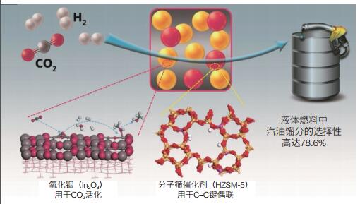 中国科学院上海高等研究院研究团队通过成功设计新型高性能催化剂[17],在co2加氢一步转化高选择性合成汽油方面取得新突破(图 5)。在该催化剂上,co2加氢烃类产物中汽油馏分的选择性高达80%,而ch4仅有1%,且烃类组分以高辛烷值的异构烃为主,因此是航空汽油和车用汽油的优良替代燃料,具备了示范应用的条件。该工作被认为是co2转化领域的一大突破,为co2转化为化学品及燃料提供了重要的平台。