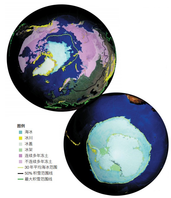 地球陆地冰冻圈覆盖了全球陆地面积的52%— 55%。其中,山地冰川和南极冰盖、格陵兰冰盖覆盖了全球陆地面积的10%;积雪覆盖陆地范围平均为1.3%—30.6%,北半球多年平均最大积雪范围可占北半球陆地表面的49%;多年冻土区占全球陆地的9%—12%,北半球季节冻土(含多年冻土活动层)为33%。也有资料显示,北半球季节冻土多年平均最大可占到北半球陆地面积的56%以上,极端寒冷年份高达80%以上。