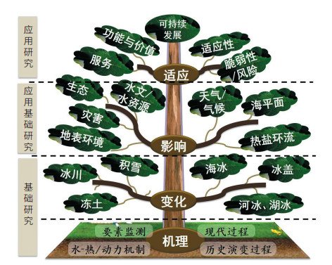 冰冻圈科学主要由冰冻圈各个要素的水热和动力机制和过程监测、变化、影响和适应研究4个阶层组成(图 2) [5]。