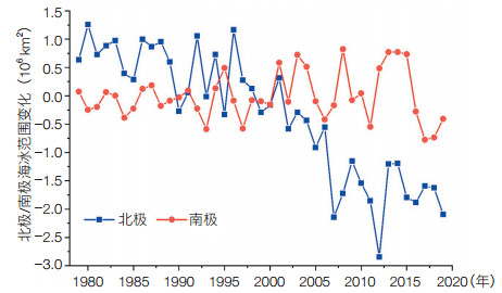| 图 4 1979—2019年北极海冰和南极海冰范围的变化(相对于1981—2010年平均) 资料来源:美国国家冰雪数据中心(nsdic) |