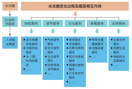 冰冻圈供给服务是指冰冻圈本身能够给人类提供的各种产品或服务,包括淡水资源、天然冷能、种质资源、天然气水合物和冰(雪)材等供给服务;冰冻圈调节服务是指人类从冰冻圈过程和功能的调节中获得的惠益,包括气候调节、径流调节、水源涵养、生态调节和陆表侵蚀调节;冰冻圈文化服务指人类能够从冰冻圈获得的精神满足和发展认知等非物质性收益,包括美学、灵感、宗教、知识与教育、休闲与旅游、文化多样性等;冰冻圈承载服务是指在一定时期的陆地或海洋表层的冰冻圈作为天然冷冻固态介质,可为大规模人类迁徙、跨河道(湖泊)行进等特殊活动,以及人们所需的物质运输和工程建设提供重力支撑,包括特殊交通通道服务和设施承载服务;冰冻圈支持服务,专指人类从冰冻圈支持或主导的特殊环境中获得的惠益,包括生境支持服务、资源生成服务及地缘政治和军事服务。