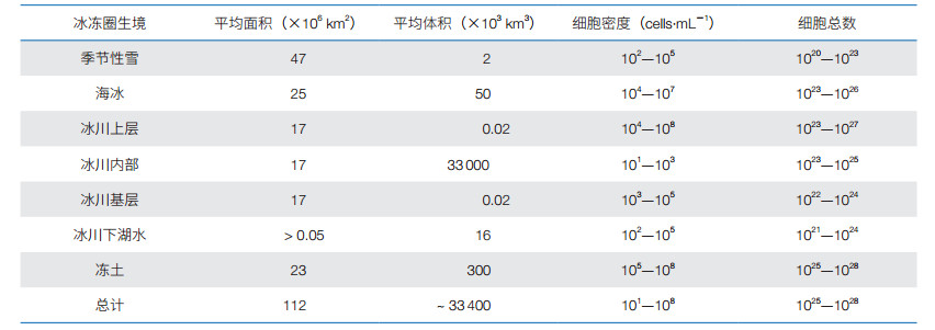 1 冰冻圈微生物的研究概况冰冻圈微生物的研究伴随着人类对极地、高山的探险和科学考察而开始,至今已开展了100多年的研究[2],经历了大致3个发展阶段:微生物形态学研究、微生物生理学研究和微生物组学研究。冰冻圈微生物研究范围涵盖了冰冻圈的主要要素——冻土、冰川、雪和海冰等;研究人员已经从冰冻圈各要素中发现并分离到多样性丰富的微生物类群,包括古菌、细菌和真菌等。最近一项权威的关于冰冻圈各生境中微生物细胞数量及总量的分析数据见表 1[3]。