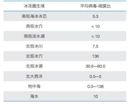 1.3 冰冻圈病毒冰冻圈生境营养水平低,生物链很短,因而,病毒对冰冻圈生态系统和物质循环具有重要影响。病毒通过裂解宿主细胞,控制细菌和真菌的多样性和丰富度,并可向环境中释放有机物质;通过基因水平转移,影响宿主细菌演化与进化[13]。近年来,随着病毒宏基因组技术的成熟,冰冻圈病毒的研究成为热点,特别是对南北两极冰川[14]、冰架、湖水[15]、土壤[16]和海冰[17]等,进行了较广泛和深入地研究。至今,在南极和北极的各种生境中检测到相对高丰度和多样性病毒,包括噬菌体、环状单链dna病毒、双链dna病毒、浸染藻类的phycodnaviruses和噬病毒体(virophages)等dna病毒,以及picornavirales等rna病毒[18]。在南极taylor valley冰穴鉴定到归属于microviridae科dna病毒[19]。计算机分析估计在南极冰层湖泊中存在大约10 000种病毒,远高于北美湖泊中的约800种病毒[20]。南极和北极海冰中类病毒粒子(virus-like particles)的密度达到105—108 ml−1 [17];在南极海冰冰芯中类病毒粒子平均丰度10.9×105 ml−1,平均病毒-细菌比(virus-to-bacteria ratio) 5.3 [21, 22]。平均病毒-细菌比是了解冰冻圈中病毒丰度及其与宿主关系的指标,尽管不同生境中这一数据变化较大,但是已经收集到的数据表明,南极和北极的冰及冰穴中具有很高的病毒-细菌比(表 2)。