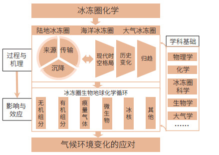 冰冻圈是气候系统中最为敏感的圈层,也是全球变化的放大器。冰冻圈主要分布在极地和高寒区域,受局地人类活动的影响较小;因此,冰冻圈化学作为“指纹信息”,可以反映区域或全球尺度气候与环境变化的信息,有利于获得不同气候和环境因子的演化过程。同时,冰冻圈独特的物质能量交换和快速的相变过程,对于气候变暖和人类活动极为敏感,是参与全球生物地球化学循环的重要圈层之一。在全球变暖和人类活动双重驱动下,冰冻圈生物地球化学循环与各类化学组分正在经历快速的变化过程,给气候和环境带来显著的反馈效应。
