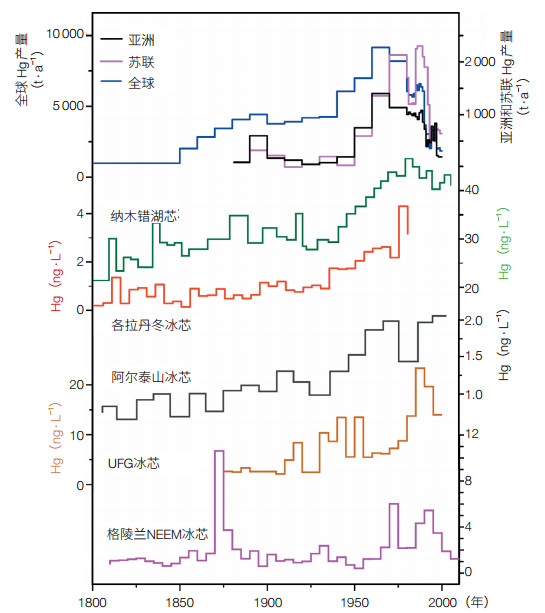 冰芯和冰冻圈高山湖泊化学记录是解密人类排放污染物历史变化的重要“指纹”。以重金属汞(hg)污染物为例,全球已有多支冰芯和湖芯历史记录研究[15-18]。从图 2来看,自工业革命以来,全球冰冻圈区域大气汞沉降均呈现快速上升的趋势,与全球人类活动大量生产汞和快速释放汞污染物密切相关[19]。随着人类的环境保护意识增强,近几十年来欧洲和北美发达国家采取强力减排措施,这些地区的人类活动释放的汞污染物也呈一定的下降趋势[15, 16](图 2)。然而,亚洲地区阿尔泰山和各拉丹冬冰芯汞浓度在最近几十年仍表现为显著增加趋势[17, 18],这与亚洲快速的经济和工业发展密切相关。研究表明,亚洲已成为人类活动汞排放的最重要的源区,约占全球总排放量的一半以上[20]。
