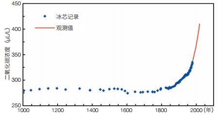 3.2 冰芯中温室气体含量记录推动温室气体减排政策的制定现代气候变暖主要是由于大气温室气体含量增加引起的。全球变暖会带来冰川融化与海平面上升、极端天气事件频发、自然灾害加剧、土地荒漠化、水资源安全与生态安全等一系列关系国计民生的重大问题,因此各国政府与国际组织极为关注全球变暖问题。冰芯记录表明,大气中co2含量在过去几十万年的时间里从未超过300 μl/l,而且在冰期-间冰期时间尺度上其变化振幅为80—120 μl/l;1750年,地球大气中co2含量约为280 μl/l(图 2),维持在间冰期的自然含量水平之内。然而,随着人类工业化进程的加快和化石燃料的大量消耗,使得地球大气co2含量在20世纪初就超过了300 μl/l;到2006年时观测到的地球大气co2含量已超过380 μl/l;2016年已上升到400 μl/l以上。目前,地球大气中co2含量已远远超出了间冰期时大气中co2自然含量的上限,而且在工业化以来地球大气中co2含量的上升幅度已经达到甚至超过了地球大气co2含量在10万年周期上的自然变化幅度。除co2外,冰芯记录的n2o和ch4含量自1850年以来也迅速上升。人类活动排放引起的大气温室气体含量的快速增加,已引起了全球科学家及各国政府的广泛关注,催生了温室气体减排方案的制定。鉴于目前大气温室气体含量仍处于“高速”上升状态,减少温室气体排放、应对全球变暖刻不容缓。