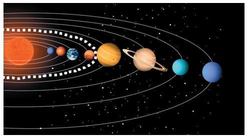 | 图 1 太阳系中太阳、八大行星和雪线的位置 从左到右的星球依次为:太阳、水星、金星、地球、火星、木星、土星、海王星和天王星;火星与木星之间的白色虚线为雪线 |