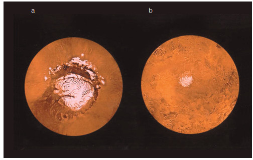 | 图 2 火星南北两极地区永久冰帽图像 (a)北极冰帽;(b)体积相对较小的南极冰帽;资料来源:nasa/jpl/usgs |