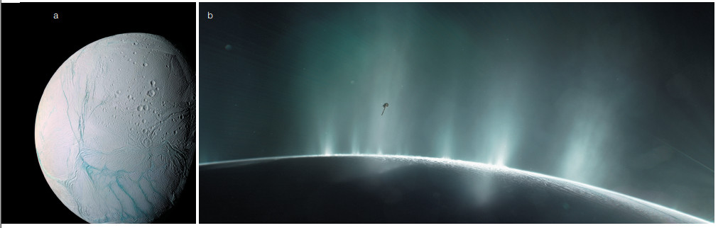 | 图 4 “卡西尼号”飞船拍摄的土卫二照片 (a)伪彩色图,显示土卫二全球均被水冰冰壳所覆盖;其中,右上方可见较为密集的陨石坑,下方4条平行的淡蓝色条纹是南极区域的“老虎纹”,也是“喷泉”喷发的位置;(b)土卫二南极“老虎纹”所喷出的气体和固体喷泉;资料来源:nasa pia07800,pia11688 |