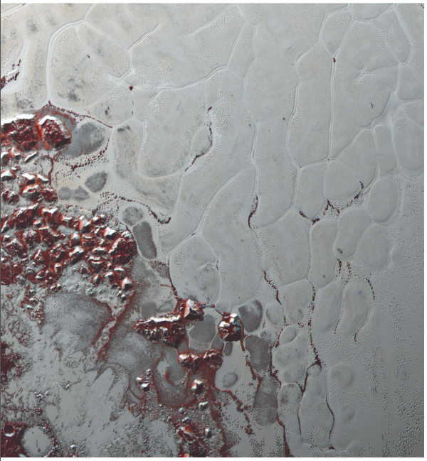 | 图 5 “新视野号”探测器拍摄的冥王星斯普尼克平原上的氮冰川照片 画面的实际尺寸约400 km;多边形的长宽大约30 km左右,是由于氮冰川在地热作用下对流运动造成的;图的左下侧,棕色的山峰高度约2—3 km,是由水冰组成的;图中的小麻点,尺度约几百米,是由于一些低反照率物质造成的氮冰挥发形成的“坑洞”;资料来源: |