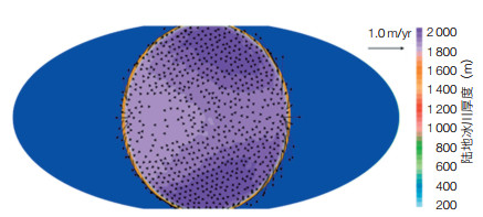 图 6是使用海-气耦合气候模式和冰川模式模拟的锁相行星背阳面陆地上的冰川厚度[20]。在该模拟试验中,锁相行星的地热通量和重力加速度均与地球的相同,背阳面冰盖厚度最大可达到2 km,冰川移动最大速度是每年1.0 m。以地球的海洋平均深度4 km为例,如果一颗锁相行星背阳面的冰盖厚度为2 km,其朝阳面还应该有2 km深的海洋。但如果整个海洋深度较浅,则很可能朝阳面没有液态水存在,该行星将是非宜居的。