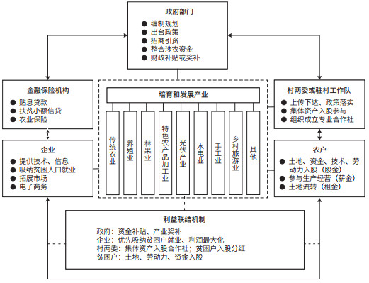 我国产业扶贫类型多样、功能多元、特色各异,涉及第一、二、三产业门类。产业扶贫的根本目标是要构建支撑贫困地区发展的主导产业,引导贫困人口参与产业发展,并通过利益联结机制使贫困群体受益,不断增强贫困地区内生发展动力和生产经营活力。在精准扶贫实践中,多数贫困地区能够以市场为主导,调整产业结构和经济结构,依托地方优势资源,不仅培育出了适合于贫困地区发展的特色产业,还探索出了“以县为单元、资源整合、整村推进、连片开发”成功经验,形成了龙头企业、合作社、村两委、农户等不同主体之间相互联动、利益联结的创新机制。