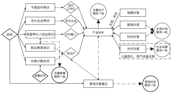 新时代我国产业扶贫贯穿于精准扶贫十大工程和“五个一批”措施中。精准扶贫战略实施中,各级政府积极适应市场需求变化、加快优化产业结构,以财政补贴的方式加大对贫困地区的“输血”力度;以产业扶贫为抓手,全面推进实施精准扶贫十大工程和“五个一批”举措(图 2)。具体而言:①干部驻村帮扶。各级政府选派干部到贫困村或软弱涣散村担任第一书记并组建驻村工作队,为乡村转型发展注入强有力的外生力量;驻村工作队在落实产业扶贫政策,推进产业扶贫措施落地方面起到了关键作用。②龙头企业带动。各地区以财政补贴、税收减免、项目支持等优惠政策措施,引进龙头企业并充分发挥其辐射带动作用。③致富带头人创业培训。通过乡村致富带头人创业培训,扶持有意愿的能人或返乡创业者,培育新型经营主体,优先吸纳贫困户就业,促进贫困户增收。④职业教育培训。对有劳动能力且有就业意愿但无劳动技能的贫困人口进行职业教育培训,增强其劳动技能,提升贫困户产业发展能力,促进发展教育脱贫一批目标的实现。扶贫实践表明,通过多主体共同参与,我国已在贫困地区逐步构建起了“政府 龙头企业 新型经营主体 贫困户”的产业经营体系。⑤扶贫小额信贷。在金融保险机构参与下,金融机构提供的扶贫小额信贷优惠政策有效解决了贫困户发展生产过程中的资金短缺问题。⑥易地扶贫搬迁。作为脱贫攻坚的头号工程,其有效解决了“一方水土养不了一方人”的问题,搬迁户后续帮扶离不开产业扶持。⑦构树扶贫。政府通过多种方式在全国贫困地区开展杂交构树种植,以构树为饲料养殖,形成“林-料-畜”一体化畜牧产业扶贫模式。⑧旅游扶贫。乡村旅游业是一个关联度高、涉及面广、辐射带动力强的综合产业,其主要是贫困地区依托其独特的旅游资源条件、市场基础和区位优势,培育乡村多功能价值,通过乡村旅游业的发展拓展贫困户就业渠道,带动贫困地区发展和贫困户增收。⑨光伏扶贫。作为普惠性的扶贫产业项目,通过光伏扶贫为弱劳动力、丧失劳动力的贫困家庭定期发放财产性分红,满足其日常生活需求,确保社会保障兜底一批的稳定性。因此,光伏扶贫是资产收益扶贫的有效方式,是产业扶贫的有效途径。⑩电商扶贫。农村电子商务的发展打通了贫困地区农产品的市场,搭建起贫困地区农副产品与互联网大市场、国际跨境市场的桥梁,帮助贫困地区搭建产业链和分销渠道,拓展农村市场,有效促进了贫困地区的产业发展和贫困户就业增收,为贫困地区发展注入了新的活力和动力。