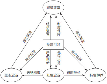 原有井冈山红色旅游发展受到交通不便、景区基础设施薄弱和管理方式落后等方面的限制,旅游产品单一,市场辐射范围窄,农民从旅游业受益程度低,对区域经济的带动能力弱。近年来,井冈山因势利导,围绕打造“全国闻名的国民素质提升地”,依托中国井冈山干部学院和全国各级机关在井冈山设立的培训基地,适应时代需要,深入挖掘红色文化内涵,打造出集培训、参与、体验为一体的红色培训“井冈模式”,成为井冈山红色旅游业快速发展新的增长点[29]。以红色旅游产业为支撑,井冈山深入挖掘红色资源和开发红色旅游产品,并依托该区域良好自然资源推动乡村生态旅游的发展,提升旅游业的经济辐射和带动能力,辐射带动生态旅游和特色种养殖业的发展(图 3)。同时,井冈山还通过资金担保、技能培训、招商引资等方式大力培育和发展毛竹、茶叶、果业、食用菌、蔬菜和特种养殖六大扶贫产业,拓宽了贫困户收入渠道和促进了贫困群体稳定增收。