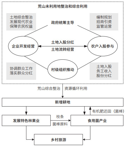 耕地资源占有量不足是我国农村贫困的重要原因之一。土地整治是增加贫困地区耕地数量、提升耕地质量,助推现代农业产业发展和乡村振兴的重要途径[30-32]。阜平县隶属于河北省保定市,位于太行深山区,是革命老区和国家级贫困县;县域面积2 496平方公里,总人口22.8万人。阜平为全山区县,山地面积占总面积的87%,耕地面积仅为21.9万亩,人均不到1亩,有“九山半水半分田”之称。阜平县贫困范围广,贫困程度深,发展基础弱;2014年全县有贫困人口10.81万人,贫困发生率为54.4%。阜平县有256万亩未利用地,其中25°以下未利用地52万亩。2013年精准扶贫国家政策实施以来,阜平县立足其资源优势,借助国家支持贫困地区城乡建设用地增减挂钩结余指标异地流转的政策推进土地整治工程扶贫;从2016年开始,阜平县把推进荒山整治开发作为打赢脱贫攻坚战的突破口,探索并建立了“政府统筹主导 村级组织推动 农户入股参与 企业开发经营”四位一体的农业开发模式。该模式以占补平衡政策为支撑,与企业合作,对未利用地进行高标准开发。整治后的土地用于发展林果业和食用菌产业,果树的枝条用作菌棒原料,废弃的菌棒制作、加工为有机肥再还田,从而实现了资源的循环利用;同时,林果产业发展又促进了乡村旅游,实现了经济效益、生态效益、社会效益的共赢(图 4)。