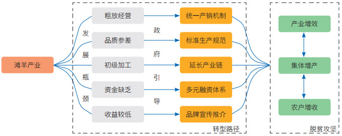 3.3 宁夏盐池县滩羊产业精准扶贫模式盐池县位于我国北方农牧交错带,属温带大陆性季风气候,包括北部风沙滩区、中部引黄灌溉农区、南部黄土丘陵区等三大地理单元。其县境内自然资源丰富、文化底蕴深厚、地域特色鲜明,被誉为“中国滩羊之乡”“中国黄花之乡”“五彩盐洲” [33]。盐池县农业乡村发展面临的主要问题是区域性干旱缺水、生态脆弱、地广人稀,是国家级贫困县。2017年盐池县脱贫退出,成为宁夏回族自治区首个摘帽贫困县。盐池县独特的水草条件为滩羊养殖提供了适宜环境,但单户养殖滩羊产业规模化、专业化、集约化程度较低,这制约着当地乡村发展和农民增收[34]。在国家产业扶贫政策的持续推动下,盐池县重点依托“中国滩羊之乡”的品牌优势,坚持市场导向、政府引导,以破解滩羊产业发展瓶颈和实现农民脱贫增收为目标,探索出了独特的盐池县滩羊产业精准扶贫模式(图 5)。