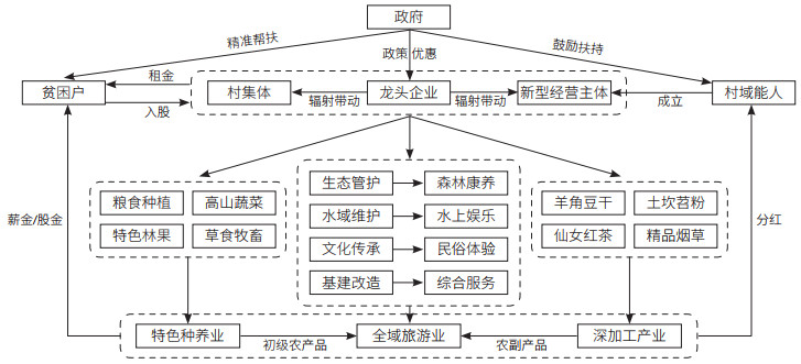 3.4 重庆武隆区全域旅游产业减贫模式重庆武隆区地处武夷山区集中连片贫困区,是渝东南少数民族聚居区和典型的喀斯特地貌区;武隆区农村基础设施薄弱,人均耕地不足,贫困程度较深。伴随着人们对优美生态环境需求的日益增长,生态资源已成为武隆区脱贫攻坚和乡村振兴的后发优势。武隆区秉持“绿水青山就是金山银山”“山水林田湖草是生命共同体”的发展理念,依托优质生态资源优势,大力推进生态产业化和产业生态化,探索出全域旅游减贫模式,实现了生态环境保护和扶贫开发的共赢(图 6)。