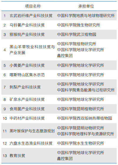 2 打造特色科技扶贫项目,形成可持续发展长效模式中国科学院不断加大对水城县帮扶力度,仅2017年和2018年这两年共投入科技扶贫项目资金1 455万元,以水城县脱贫攻坚产业发展和科技需求为导向,涉及农业、工业、生态、旅游、教育等多个领域共13个项目(表 1)。通过先进技术引进、高附加值产品研发、示范推广、培训技术能手等多种方式全面提升产业扶贫效益,增强产业持续发展动力。贫困人口不仅在增产提效、扩大就业中直接获益、增加收入,并形成可持续发展的长效模式,从而实现精准脱贫。