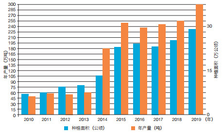 | 图 1 2010—2019年中国猕猴桃种植总面积及总产量 2016年及以前数据来源于2016 world kiwifruit review |