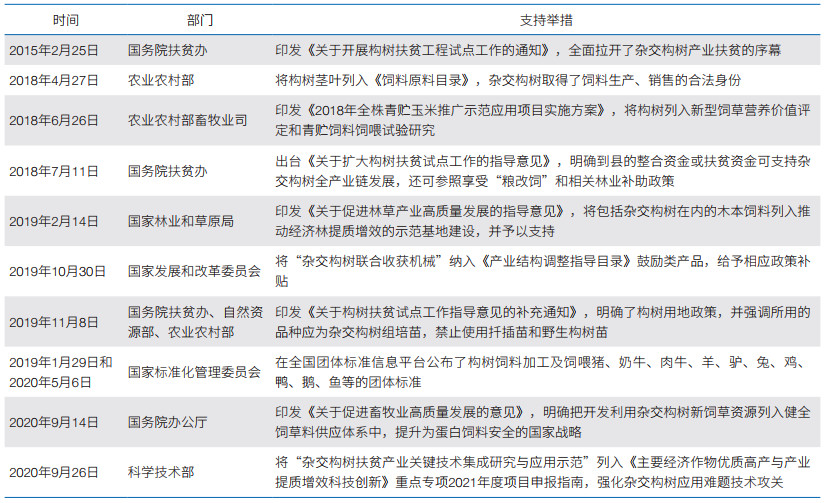1 领导重视,政策支持构树扶贫工程得到党和国家领导人极大关注和高度重视。2019年6月4日,中共中央政治局委员、国务院副总理胡春华考察河南兰考杂交构树“林-料-畜”产业化基地,对构树扶贫工程予以高度评价,对在黄河滩区种植杂交构树发展生态农牧业予以充分肯定;陪同考察的农业农村部相关领导也认为,杂交构树是很好的蛋白质原料,是农业供给侧结构性改革和“粮改饲”的好项目。2019年11月30日,胡春华副总理在全国畜牧业工作会议上强调,发展杂交构树是建立现代饲料供应体系的有益探索,要继续推动畜牧业在产业扶贫中发挥作用,为脱贫攻坚和保供应作出应有贡献。国务院扶贫办协调有关部委和单位,出台相关政策,构建杂交构树产业发展政策支持体系(表 1)。各级地方政府在推动构树扶贫工程的过程中,大部分下发了指导意见,并出台了一些落地的支持政策。