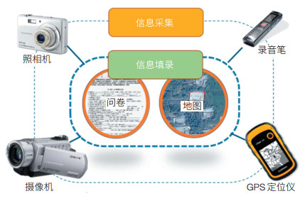 4.1 基于移动互联的数据采集技术创新在实践的基础上,评估团队将原评估工作中使用的“一套问卷、一部摄像机、一支录音笔、一个照相机、一部gps终端设备、一幅地图”的6个功能,集成到手机应用程序(app),即“六合一”(图 8)。“大数据平台通过检测移动设备的gps信息,可以检测第三方评估调查人员的实时地理位置及行动轨迹,实时统计全国调查农户的点位,以及调查县、乡镇、行政村的数据,并利用多种统计图表,实时显示各项调查指标的统计结果,及时了解调查进展情况和实际问题。”龙花楼介绍道。