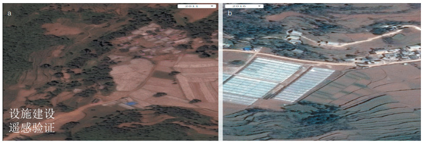 大数据平台应用了海量的多源异构数据,包括问卷数据、高分辨率遥感影像、交通道路网、照片、录音、录像等,为评估过程提供多方面的数据支撑。例如,照片、录像可以直观的验证农户院落外观、房屋结构、家居陈设、粮食储备、饮水设施、卫生状况等情况,做到“有图有真相”。对不同时期的高分辨率遥感影像数据进行叠加对比分析,可直观验证扶贫基础设施建设或产业发展项目的变化。龙花楼说,“比如,通过叠加基础设施建设前、后两期遥感影像,再利用图层卷帘功能,就能客观分析某贫困地区有没有新修建的道路、大棚、住宅,搬迁是不是都做了……尤其对于山高路远的地方,通过遥感影像对比,就能够验证贫困地区的基础设施建设情况。”(图 9)