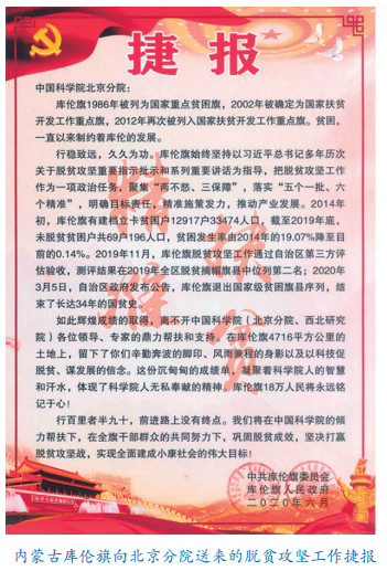 2020年6月,一份大红色的脱贫攻坚工作捷报送到了中国科学院科技创新发展中心(北京分院)(以下简称“科创中心(北京分院)”)。在中国科学院多年持续定点扶贫下,通过科技扶贫、产业扶贫、“志智双扶”、消费扶贫,2020年3月5日,内蒙古库伦旗退出国家级贫困旗县序列,终于摘掉了长达34年的国贫“帽子”。