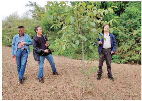 2017年,王能干村种下了第一批的3 000株核桃苗。苗子种下,陈正文像操心自家孩子一样操心着这些苗子,生怕有个闪失。好在第一年种的核桃苗都成活了,第二年开始陆陆续续地挂果了(图 6)。陈正文让村民们一定要把果剪掉不要,修整好树形,第3年才是最佳的收获期。种下的核桃都活了,光这些核桃树,进入盛果期后,预计就可以让王能干村的村民们每年增加不菲的收入。