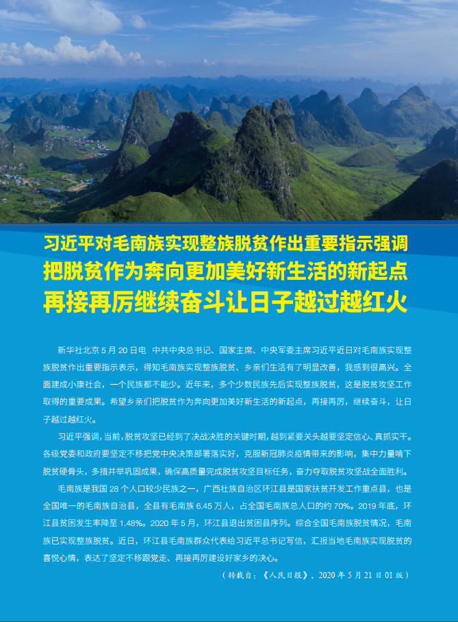 习近平对毛南族实现整族脱贫作出重要指示强调把脱贫作为奔向更加美好新生活的新起点再接再厉继续奋斗让日子越过越红火. 中国科学院院刊, 2020, 35(z2): 封二-封二