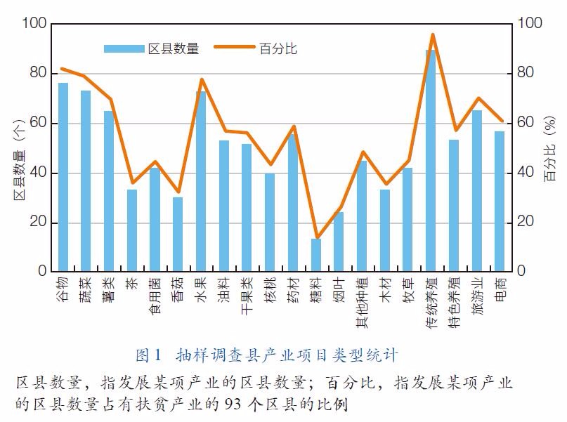 (1)扶贫产业项目选择缺乏综合评估,产业市场风险大。一些地区产业项目选择时缺乏本地资源禀赋的深入挖掘和市场环境综合分析,重短期收益、轻长期效益。不少市县扶贫项目存在产业同质性、低级重复性、区域雷同、贪大求快等问题。根据典型县域抽样调查显示,在113个抽样调查区县中93个区县有产业扶贫,其中大棚蔬菜、薯类、食用菌、猕猴桃等水果以及药材、集约养殖等产业项目规模较大、同质性较突出(图1)。部分扶贫项目盲目追求数量规模,忽略农业发展规律,生产和管理成本大,造成扶贫资源浪费,部分农户利益受损甚至导致“因扶致贫”。